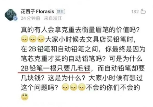 9月26日,花西子在微博发布评论称“真的有人会拿克重去衡量眉笔的价值吗?”并用买2B铅笔和自动铅笔来做事例进行比较。