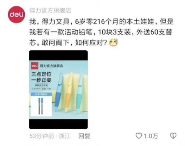 随后便引发文具品牌的重视,得力文具在交际渠道回怼:我若有一款活动铅笔,10块3支装,外加60支替芯。敢问尊下,怎么应对?