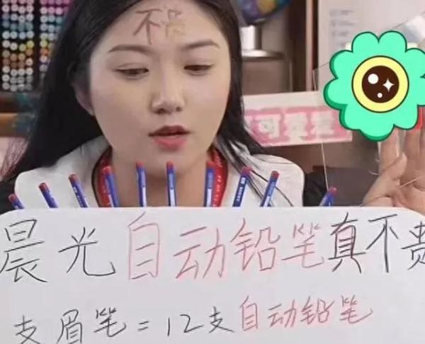 除此之外,有网友发现,在晨光官方旗舰店的直播间,主播举着“自动铅笔线支自动铅笔,一支眉笔=150支铅笔”字样的手写牌。而且还把“不贵”写在脸上,还各种砸铅笔,说砸不坏,眉笔用了还会断。网友戏弄,花西子引发的“泼天的富有”要到文具届了。